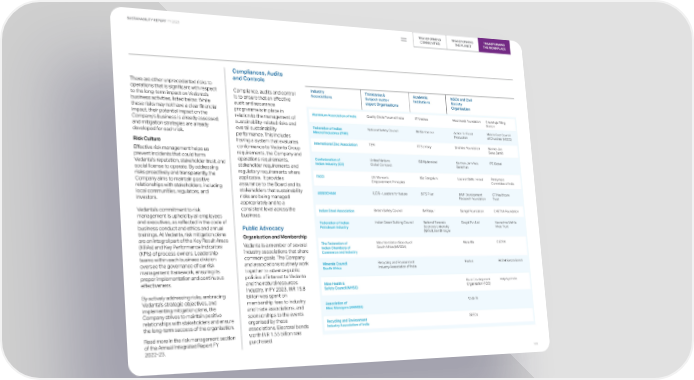 TRANSFORMING TRANSFORMING TRANSFORMING SUSTAINABILITY REPORT FY 2023 COMMUNITIES THE PLANET THE WORKPLACE Compliances, Audits and Controls There are other unprecedented risks to Industry Thinktanks & Academic NGOs and Civil operations that is significant with respect Compliance, audits and control Associations Subject-matter Institutions Society to the long-term impact on Vedanta’s is to ensure that an effective expert Organisations Organisation business activities, listed below. While audit and assurance these risks may not have a clear financial programme is in place in Aluminium Association of India Quality Circle Forum of India IIT Madras Wockhardt Foundation Charbhuja Filling impact, their potential impact on the relation to the management of Station Company’s business is already assessed, sustainability-related risks and and mitigation strategies are already overall sustainability Federation of Indian National Safety Council IIM Sambalpur Action for Food Middle East Council developed for each risk. Mineral Industries (FIMI) Production of Churches (MECC) performance. This includes Risk Culture having a system that evaluates International Zinc Association TERI IIT Bombay Drishtee Foundation Barmer Jan conformance to Vedanta Group Sewa Samiti Effective risk management helps us requirements, the Company and prevent incidents that could harm operations requirements, Confederation of United Nations ISB Hyderabad Sarthak Jan Vikas IPE Global Vedanta's reputation, stakeholder trust, and stakeholder requirements and Indian Industry (CII) Global Compact Sansthan social license to operate. By addressing regulatory requirements where risks proactively and transparently, the applicable. It provides FICCI UN Women’s IISc Bengaluru Learnet Skills limited Paralympic Company aims to maintain positive Empowerment Principles Committee of India relationships with stakeholders, including assurance to the Board and its local communities, regulators, and stakeholders that sustainability ASSOCHAM IUCN – Leaders for Nature BITS Pilani BAIF Development GT Healthcare investors. risks are being managed Research Foundation Trust appropriately and to a Vedanta’s commitment to risk consistent level across the Indian Steel Association British Safety Council IIM Raipur Sehgal Foundation CHETNA Foundation management is upheld by all employees business. and executives, as reflected in the code of Federation of Indian Indian Green Building Council National Forensic Swajal Pvt. Ltd Navrachna Mahila business conduct and ethics and annual Public Advocacy Petroleum Industry Sciences University Vikas Trust trainings. At Vedanta, risk mitigation plans (NFSU), Gandhinagar are an integral part of the Key Result Areas Organisation and Membership (KRAs) and Key Performance Indicators Vedanta is a member of several The Federation of Mine Ventilation Society of Waterlife CEDRA industry associations that share Indian Chambers of South Africa (MVSSA) (KPIs) of process owners. Leadership Commerce and Industry teams within each business division common goals. The Company oversee the governance of our risk and associations routinely work Minerals Council Recycling and Environment Fontus BODH Siksha Samiti management framework, ensuring its together to advance public South Africa Industry Association of India proper implementation and continuous policies of interest to Vedanta effectiveness. and the natural resources Mine Health & Rural Development HelpAge India industry. In FY 2023, INR 15.8 Safety Council (MHSC) Organisation (RDO) By actively addressing risks, embracing billion was spent on Vedanta’s strategic objectives, and membership fees to industry implementing mitigation plans, the and trade associations, and Association of Vodalife Company strives to maintain positive Mine Managers (AMMSA) relationships with stakeholders and ensure sponsorships to the events the long-term success of the organisation. organised by these Recycling and Environment SEEDs associations. Electoral bonds Industry Association of India Read more in the risk management section worth INR 1.55 billion was of the Annual Integrated Report FY purchased. 2022-23. 105