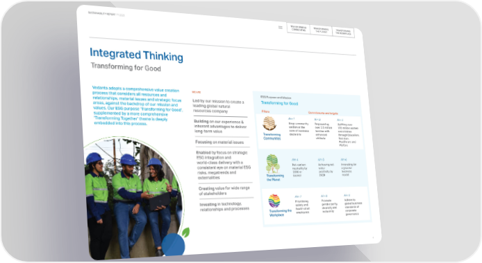 TRANSFORMING TRANSFORMING TRANSFORMING SUSTAINABILITY REPORT FY 2023 COMMUNITIES THE PLANET THE WORKPLACE Integrated Thinking Transforming for Good Vedanta adopts a comprehensive value creation WE ARE process that considers all resources and ESG Purpose and Mission relationships, material issues and strategic focus Led by our mission to create a Transforming for Good areas, against the backdrop of our mission and leading global natural values. Our ESG purpose ‘Transforming for Good’, resources company Pillars Commitments and targets supplemented by a more comprehensive Aim 1 Aim 2 Aim 3 ‘Transforming Together’ theme is deeply Building on our experience & Keep community Empowering Uplifting over embedded into this process. inherent advantages to deliver welfare at the over 2.5 million 100 million women long-term value core of business families with and children Transforming decisions enhanced through Education, Communities skillsets Nutrition, Focusing on material issues Healthcare and Welfare Enabled by focus on strategic ESG integration and Aim 4 Aim 5 Aim 6 world-class delivery with a Net-carbon Achieving net Innovating for consistent eye on material ESG neutrality by water a greener risks, megatrends and 2050 or positivity by business externalities Transforming sooner 2030 model the Planet Creating value for wide range of stakeholders Aim 7 Aim 8 Aim 9 Investing in technology, Prioritising Promote Adhere to relationships and processes safety and gender parity, global business Transforming the health of all diversity and standards of Workplace employees inclusivity corporate governance 4