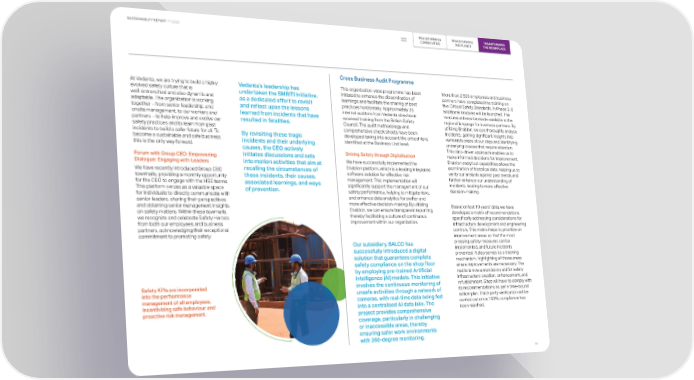 TRANSFORMING TRANSFORMING TRANSFORMING SUSTAINABILITY REPORT FY 2023 COMMUNITIES THE PLANET THE WORKPLACE Cross Business Audit Programme At Vedanta, we are trying to build a highly Vedanta’s leadership has This organization-wide programme has been More than 2,500 employees and business evolved safety culture that is undertaken the SMRITI Initiative, initiated to enhance the dissemination of partners have completed the training on well-entrenched and also dynamic and as a dedicated effort to revisit learnings and facilitate the sharing of best five Critical Safety Standards. In Phase 2, 6 adaptable. The organization is working and reflect upon the lessons practices horizontally. Approximately 25 additional modules will be launched. The together – from senior leadership, and learned from incidents that have internal auditors from Vedanta sites have modules will also be made available in the onsite management, to our workers and received training from the British Safety regional language for business partners. By partners – to help improve and evolve our resulted in fatalities. Council. The audit methodology and utilizing Enablon, we can thoroughly analyse safety practices and to learn from past comprehensive check sheets have been incidents, gaining significant insights into incidents to build a safer future for all. To By revisiting these tragic developed taking into account the critical risks vulnerable areas at our sites and identifying become a sustainable and safe business, incidents and their underlying identified at the Business Unit level. underlying causes that require attention. this is the only way forward. causes, the CEO actively This data-driven approach enables us to initiates discussions and sets Driving Safety through Digitalisation make informed decisions for improvement. Forum with Group CEO: Empowering We have successfully implemented the Enablon analytical capabilities allows the Dialogue: Engaging with Leaders into motion activities that aim at Enablon platform, which is a leading integrated examination of historical data, helping us to We have recently introduced Group CEO recalling the circumstances of software solution for effective risk verify our analysis against past trends and townhalls, providing a monthly opportunity these incidents, their causes, management. This implementation will further enhance our understanding of for the CEO to engage with the HSE teams. associated learnings, and ways significantly support the management of our incidents, leading to more effective This platform serves as a valuable space of prevention. safety performance, helping to mitigate risks, decision-making. for individuals to directly communicate with and enhance data analytics for swifter and senior leaders, sharing their perspectives more effective decision-making. By utilizing and obtaining senior management insights Enablon, we can ensure transparent reporting, Based on last 10 years’ data, we have on safety matters. Within these townhalls, thereby facilitating a culture of continuous developed a matrix of recommendations we recognize and celebrate Safety Heroes improvement within our organization. specifically addressing considerations for from both our employees and business infrastructure development and engineering partners, acknowledging their exceptional controls. This matrix helps to prioritize on commitment to promoting safety. improvement areas so that the most Our subsidiary, BALCO has pressing safety measures can be successfully introduced a digital implemented, and future incidents solution that guarantees complete prevented. It also serves as a tracking safety compliance on the shop floor mechanism, highlighting all those areas where improvements are necessary. The by employing pre-trained Artificial matrix is now a mandatory aid for safety Intelligence (AI) models. This initiative infrastructure creation, enhancement, and Safety KPIs are incorporated involves the continuous monitoring of refurbishment. Sites will have to comply with into the perfiormance unsafe activities through a network of its recommendations as per a time-bound management of all employees, cameras, with real-time data being fed action plan. Third-party verification will be incentivizing safe behaviour and into a centralized AI data lake. The carried out once 100% compliance has proactive risk management. project provides comprehensive been reached. coverage, particularly in challenging or inaccessible areas, thereby ensuring safer work environments with 360-degree monitoring. 89