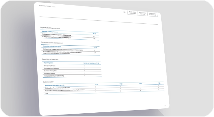 TRANSFORMING TRANSFORMING TRANSFORMING SUSTAINABILITY REPORT FY 2023 COMMUNITIES THE PLANET THE WORKPLACE Capacity building programs Capacity building programs FY 23 Total number of suppliers in capacity building programs 492 % of significant suppliers in capacity building programs 44% Corrective action plan support Corrective action plan support FY 23 Total number of suppliers supported in corrective action plan implementation 5 % of suppliers assessed with substantial actual/potential negative impacts 2% supported in corrective action plan implementation Reporting on breaches Reporting areas Number of breaches in FY 23 Corruption or Bribery 14 Discrimination at Workplace 7 Customer Privacy Data 0 Conflicts of Interest 4 Money Laundering or Insider trading 0 Cybersecurity Breaches of information security FY 20 FY 21 FY 22 FY 23 Total number of information security breaches 0 0 0 0 Total number of clients, customers and employees affected by the breaches 0 0 0 0 Total 0 0 0 0 135