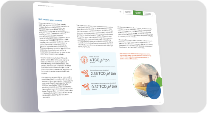 TRANSFORMING TRANSFORMING TRANSFORMING SUSTAINABILITY REPORT FY 2023 COMMUNITIES THE PLANET THE WORKPLACE Shift towards green economy Consumer preferences have been steadily The unique quality of these products is their low GHG emissions With the launch of the Restora line of products, we have become the shifting in favour of sustainable products, as the intensity, which is much below the global threshold of 4 TCO e first major non-ferrous Indian metals producer to manufacture low ravages of climate change become more 2 carbon primary aluminium. To establish credibility and validate the tonne of aluminium. Restora is produced at our state-of-the-art devastating and governments and other aluminium smelters and uses renewable energy in its production authenticity of our products as one of the most carbon-light products international bodies seek to do more for greater processes. Additionally, Restora Ultra is crafted from recovered in the market, the Restora lineup will undergo independent verification everyday impact. For every manufacturing aluminium and is infused with the qualities of the virgin metal by a reputed global assurance firm. industry, the journey towards greater through the use of cutting edge technology. Our collaboration sustainability has a product and process aspect. with Runaya Refining, a revolutionary Indian manufacturing The successful completion of this certification exercise will make it While we have already discussed the multiple startup dedicated to resource sector innovations, has given us possible for us to take these products across the world, as an changes that our traditionally energy-intensive access to this technology. Restora Ultra boasts an even lower alternative for customers who want carbon-light aluminium options. manufacturing processes are now making, carbon footprint, ranking among the world's most carbon-light Approximately US $150 million-worth of revenues were generated product innovation is another fascinating from the sale of low-carbon aluminium in FY2023. aspect of our sustainability transformation. aluminium products. This aspect involves innovative approaches like embracing circularity through the use of reclaimed and recycled material, as well as, the As an outcome of the Restora manufacturing process, we have use of ground breaking technologies. become India's largest industrial consumer of renewable energy, Global Standard with over 2 billion units of renewable energy consumed to Vedanta realized early that a shift towards produce Restora and Restora Ultra. greater sustainability offers a rare chance to 4 TCO e/ ton break out of the box, and to imagine and of metal 2 innovate along unconventional tracks. In the process, we would gain competitive advantage, build brand distinctiveness and gain a price premium too. As a market leader, we gladly took Restora (low carbon aluminium) on the role of product stewardship that was required. 2.36 TCO e/ ton Our aluminium segment offered some exciting of metal 2 possibilities. Given the traditionally high carbon footprint of alumina processing, the potential for making significant impact was very high. In FY Restora Ultra (ultra-low carbon aluminium) 2022, we launched our first line of green aluminium products, under the brandname of 0.37 TCO e/ ton Restora. Positioned as a low carbon aluminium 2 brand, Restora offers two distinct product lines of metal – Restora featuring low carbon aluminium and Restora Ultra, featuring ultra-low carbon aluminium. 60