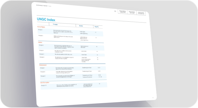 TRANSFORMING TRANSFORMING TRANSFORMING SUSTAINABILITY REPORT FY 2023 COMMUNITIES THE PLANET THE WORKPLACE UNGC Index Principle Section Page No. Human Rights Principle 1 Businesses should support and respect the Human Rights 44 protection of internationally proclaimed human Human Rights Policy rights; and Principle 2 Make sure that they are not complicit in human Human Rights due 44 rights abuses diligence process Human Rights Policy Labour Principle 3 Businesses should uphold the freedom of Right to freedom of 46 association and the effective recognition of the association right to collective bargaining; Principle 4 The elimination of all forms of forced and Human Rights 44 compulsory labour; Principle 5 The effective abolition of child labour; and Human Rights 44 Principle 6 The elimination of discrimination in respect of Human Rights 44 employment and occupation. Aim 8: Promote gender 93 parity, diversity and inclusivity Environment Principle 7 Businesses should support a precautionary Transforming the Planet 52-53 approach to environmental challenges; Principle 8 Undertake initiatives to promote greater Transforming the Planet 52-82 environmental responsibility; and Principle 9 Encourage the development and diffusion of Transforming the Planet 52-82 environmentally friendly technologies. Factsheet: Environment 115-126 Anti-Corruption Principle 10 Businesses should work against corruption in all Upholding integrity and 99 its forms, including extortion and bribery. accountability through policy infrastructure 144