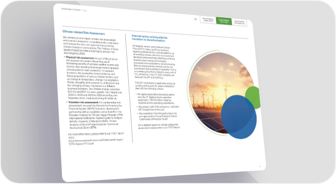 TRANSFORMING TRANSFORMING TRANSFORMING SUSTAINABILITY REPORT FY 2023 COMMUNITIES THE PLANET THE WORKPLACE Climate-related Risk Assessment Internal carbon pricing aids the transition to decarbonisation We carried out an in-depth climate risk assessment and scenario analysis to comprehensively understand At Vedanta, we are using Internal Carbon and analyse the risks and opportunities posed by Price (ICP) to future-proof our business climate change to our business. The findings of these against potential ad hoc cost escalations. By studies helped to make a roadmap to achieve Net embedding climate risks into our investment Zero target by 2050. decisions and proactively directing our focus • Physical risk assessment: As part of the physical towards clean energy technologies, risk assessment, acute risks arising out of processes and ecosystems, we are ensuring increasing severity of extreme weather events and that our preparedness extends across our chronic risks resulting from longer-term changes in businesses and countries of operation. ICP, is climate patterns were studied for 55 business a voluntary price that is linked to every unit of locations. We studied the historical trends and CO2 emissions. From FY 2023 onwards, we future projections of various climate hazards such have set the ICP at $15/tCO e. 2 as change in temperature, change in precipitation, The ICP mechanism is applicable across all floods, droughts, and cyclones to understand how our BUs and is used for capex evaluations the changing climate may impact our different that fulfil the following criteria: business locations. Two climate change scenarios RCP 8.5 and RCP 4.5 were used for two time periods • All capital expenditure (excluding admin, 2020 to 2039 and 2040 to 2059 extending over security, IT, digital and pre-operative Vedanta’s short, medium and long-time frames. expenses) > INR 50 million made by • Transition risk assessment: For our transition risk Vedanta and its operating subsidiaries. assessment, we used the Network for Greening the • Any project, with GHG emissions > 500,000 Financial System (NGFS) Scenarios developed in partnership with an academic consortium from the MT, irrespective of the cost • Any exemption from this policy has to be Potsdam Institute for Climate Impact Research (PIK), International Institute for Applied Systems Analysis pre-approved by Group Energy & Carbon Community of Practice Forum (IIASA), University of Maryland (UMD), Climate Analytics (CA) and Eidgenössische Technische For a detailed report on climate related risk Hochschule Zürich (ETH). assessment please refer to our TCFD Report For more information, please refer to our TCFD report 2023. https://www.vedantalimited.com/SiteAssets/Images/ TCFD-Report-FY23.pdf 56