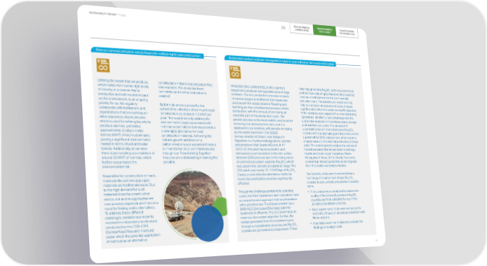 TRANSFORMING TRANSFORMING TRANSFORMING SUSTAINABILITY REPORT FY 2023 COMMUNITIES THE PLANET THE WORKPLACE Pilot on red mud utilization raises hopes for carbon-light road construction Sustainable sodium sulphate management helps in cost reduction and waste valorization Utilizing the waste that we produce, construction material and structural filler, Hindustan Zinc Limited (HZL) is the country’s internally generated Na2SO4 salts now opened up which varies from low to high levels was explored. The study has been largest zinc producer and operates several large a whole new vista of opportunity as they could be of toxicity, in a manner that is completed and further evaluation is smelters. The zinc production process consists used as a replacement for the commercially productive and with neutral impact awaited. of various stages and different techniques are procured ones. The substitution would not only on the environment, is an ongoing used as per the output desired. Roasting and help to cut down on operational costs, it would priority for us. We regularly If pilot trials prove successful, the leaching are two constituent processes of zinc significantly further the waste-to-wealth objective collaborate with institutions and potential for utilization of red mud in road production, with the removal of iron being an that underpins every aspect of our manufacturing organizations that are working on construction could reach 1.5 MMT per essential part of the production cycle. The operations. Another crucial advantage was the allied objectives. Bayer process, year. This would not only address the jarosite process is the most widely used route for substantial reduction in hazardous waste storage which is used for refining bauxite to environmental issues associated with removing iron elements from zinc, and it is and maintenance costs. The prospect of produce alumina, generates red mud accumulation but also provide a deployed in our smelters, with jarosite emerging substituting the commercial procured Na SO 2 4 approximately 3 million metric sustainable alternative for road as the waste byproduct. Our 92000 crystals with the internally generated ones carried tonnes (MMT) of red mud annually, construction materials. Achieving the tonnes-smelter at Debari, near Udaipur in a potential for 50% replacement, which meant a posing a significant environmental nation’s growth ambitions in a Rajasthan, is a hydrometallurgical zinc smelter sharp increase in the internal production of these hazard in terms of soil and water carbon-neutral way is essential if India is and produces High Grade (HG) zinc. In FY salts. This would parallelly reduce the volume of toxicity. Additionally, at our sites to meet its Net Zero commitments and 2022-23, this plant faced a problem as it hazardous waste that we are liable to manage, there is pre-existing accumulation of through our ‘Transforming Together’ witnessed a cost escalation in the zinc sulfide handle and store as per Hazardous Waste around 20 MMT of red mud, which focus we are collaborating in making this detector (ZSD) process due to the rising prices Management Rules, 2016. Clearly there were further exacerbates the possible. of commercial sodium sulphate (Na SO ) which several high-impact gains that would originate 2 4 environmental risk. was used in the Jarosite precipitation stage. The from this waste valorization initiative. ZSD plant uses nearly 12 -13 MT/day of Na SO . 2 4 Meanwhile for construction of roads, Clearly, a cost-effective alternative had to be The following steps were involved before a materials like soil and aggregate found else profitability would be significantly full-fledged transition to in-house Na SO 2 4 materials are traditionally used. Due affected. crystals-based Jarosite precipitation could be to the high demand for such done. materials from the construction Though the challenge pertained to operating sector, soil and its aggregates are costs, the Plant Operations team decided to take • First, a study was conducted to assess the quality of the internally produced Na SO now severely depleted, and there is a a comprehensive approach that would address 2 4 crystals and their suitability for use in the need for finding viable alternatives. other priorities too. The Debari smelter has a Jarosite precipitation process. To address these different 3000 KLD Zero Liquid Discharge plant for challenges, Vedanta was recently treatment of effluents. The ZLD plant helps to • Next, experimental trials were carried out to involved in a laboratory-scale study meet our zero-waste objective. Further, the verify the efficacy of Jarosite precipitation with conducted by the CSIR-CRRI sludge generated from the treatment goes these crystals. (Central Road Research Institute) through a crystallization process, and Na 2SO4 • Plant trials were then initiated to validate the under which the potential application crystals are generated as a byproduct. These findings on a larger scale. of red mud as an alternative 72