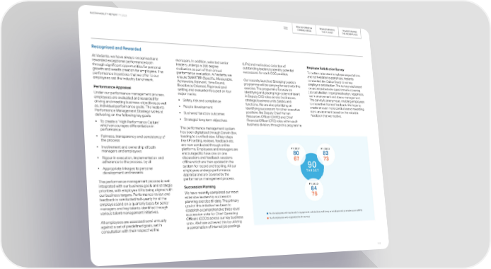 TRANSFORMING TRANSFORMING TRANSFORMING SUSTAINABILITY REPORT FY 2023 COMMUNITIES THE PLANET THE WORKPLACE Recognised and Rewarded At Vedanta, we have always recognised and managers. In addition, selected senior (IJPs) and meticulous selection of Employee Satisfaction Survey rewarded exceptional performance both leaders undergo a 360 degree outstanding leaders to identify potential To better understand employee expectations through significant opportunities for personal evaluation as part of their annual successors for each COO position. and work-related experiences, Vedanta growth and wealth creation for employees. The performance evaluation. At Vedanta, we conducted the Gallup Study to survey performance incentives that we offer to our ensure SMARTER (Specific, Measurable, Our recently launched Emerging Leaders employee satisfaction. The survey was based employees set the industry benchmark. Achievable, Relevant, Time Bound, programme will be carrying forward with this on a comprehensive questionnaire covering Excellence Oriented, Rigorous) goal exercise. The programme focuses on job satisfaction, internal motivation, happiness, Performance Appraisal setting and evaluation focused on four identifying and placing high-potential talent work environment and stress management. Under our performance management process, major tracks: in Deputy CXO roles across businesses, The survey is anonymous, enabling employees employees are evaluated and rewarded for strategic business units (SBUs), and to share their honest feedback. We hope to • Safety, risk and compliance functions. We are also prioritizing on driving and meeting business objectives,as well identifying successors for other executive create an even more conduciveand rewarding as, individual performance goals. The Vedanta • People development work environment based on the valuable Performance Management Strategy works at positions like Deputy Chief Human feedback that we receive. • Business/ function outcomes Resources Officer (CHRO) and Chief delivering on the following key goals: Financial Officer (CFO) roles within each • Strategic/ long term objectives • To create a “High Performance Culture” business division, through this programme. which encourages differentiation in The performance management system performance has been digitalized through Darwin Box, leading to a unified view. All key steps • Fairness, transparency and consistency of the process like KPI setting, reviews, feedback etc. are now conducted through online • Involvement and ownership of both platforms. Employees and managers are FY 2021 FY 2022 managers and employees encouraged to have one on one 80 83 discussions and feedback sessions • Rigour in execution, implementation and 67 73 adherence to the process, by all offline which are then updated in the system for record and tracking. All our 90 • Appropriate linkages to personal employees undergo performance TARGET development and rewards appraisal and are covered by the The performance management process is well performance management process. integrated with our business goals and strategic Succession Planning FY 2023 priorities, with employee KPIs being aligned with 84 our business targets. Performance review and We have recently completed our most feedback is conducted half-yearly for all the extensive leadership succession 76 employeesand on a quarterly basis for senior planning exercise till date. The primary managers and key talents identified through goal of this initiative has been to various talent management initiatives. establish a comprehensive three-level succession slate for Chief Operating % of employees with top level of engagement, satisfaction, wellbeing, or employee net promoter score (eNPS) All employees are assessed semi-annually Officers (COOs) across our key business % of employees who responded to the survey against a set of predefined goals, set in units. We have achieved this by utilizing consultation with their respective line a combination of internal job postings 112