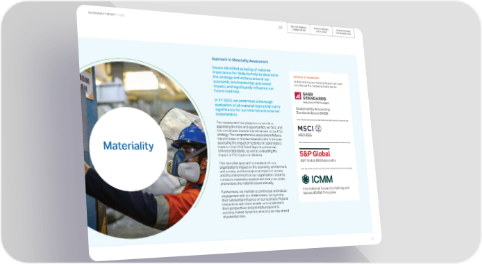 TRANSFORMING TRANSFORMING TRANSFORMING SUSTAINABILITY REPORT FY 2023 COMMUNITIES THE PLANET THE WORKPLACE Approach to Materiality Assessment Issues identified as being of material importance for Vedanta help to determine MATERIALITY FRAMEWORK the strategy and actions around our In determining our material topics, we have economic, environmental, and social considered the following frameworks: impact, and significantly influence our future roadmap. In FY 2023, we undertook a thorough evaluation of all material topics that carry Sustainability Accounting significance for our internal and external Standards Board (SASB) stakeholders. This assessment has played a crucial role in appraising the risks and opportunities we face, and has contributed towards the refinement of our ESG strategy. The comprehensive assessment follows MSCI ESG the principles of double materiality which involves assessing the impact of Vedanta on stakeholders Materiality based on the GRI (Global Reporting Initiative) Universal Standards, as well as evaluating the impact of ESG topics on Vedanta. This two-pillar approach considers both our S&P Global ESG Materiality organization's impact on the economy, environment, and society, and the reciprocal impact of society and the environment on our organization. Vedanta conducts materiality assessment every two years, and reviews the material issues annually. Furthermore, we maintain a continuous and robust International Council on Mining and engagement with our stakeholders, recognizing Metals (ICMM) Principles their substantial influence on our business. Regular interactions with them enable us to understand their perspectives and promptly respond to evolving market dynamics, ensuring we stay ahead of potential risks. 27