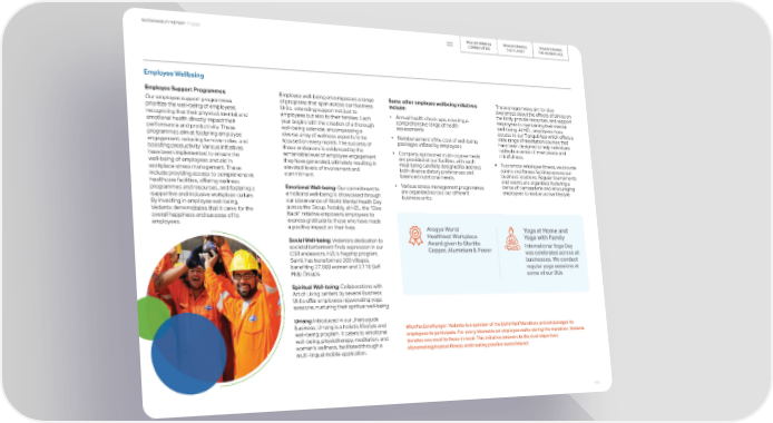 TRANSFORMING TRANSFORMING TRANSFORMING SUSTAINABILITY REPORT FY 2023 COMMUNITIES THE PLANET THE WORKPLACE Employee Wellbeing Employee Support Programmes Employee well-being encompasses a range Some other employee wellbeing initiatives These programmes aim to raise Our employee support programmes of programs that span across our Business include: awareness about the effects of stress on prioritize the well-being of employees, Units, extending support not just to the body, provide resources, and support employees but also to their families. Each • Annual health check-ups, covering a employees in maintaining their mental recognizing that their physical, mental, and year begins with the creation of a thorough comprehensive range of health well-being. At HZL, employees have emotional health directly impact their well-being calendar, encompassing a assessments access to our Tranquil App which offers a performance and productivity. These wide range of meditation courses that programmes aim at fostering employee diverse array of wellness aspects to be • Reimbursement ofthe cost of well-being have been designed to help individuals engagement, reducing turnover rates, and focused on every month. The success of packages utilized by employees cultivate a sense of inner peace and these endeavors is evidenced by the mindfulness. boosting productivity. Various initiatives remarkable level of employee engagement • Company sponsored multi-course meals have been implemented to ensure the are provided at our facilities, with each well-being of employees and aid in they have generated, ultimately resulting in meal being carefully designed to address • To promote employee fitness, we provide elevated levels of involvement and both diverse dietary preferences and sports and fitness facilities across our workplace stress management. These commitment. balanced nutritional needs. business locations. Regular tournaments include providing access to comprehensive and events are organized, fostering a healthcare facilities, offering wellness sense of camaraderie and encouraging Emotional Well-being: Our commitment to • Various stress management programmes employees to lead an active lifestyle. programmes and resources, and fostering a emotional well-being is showcased through are organized across our different supportive and inclusive workplace culture. business units. By investing in employee well-being, our observance of World Mental Health Day Vedanta demonstrates that it cares for the across the Group. Notably, at HZL, the "Give overall happiness and success of its Back" initiative empowers employees to employees. express gratitude to those who have made a positive impact on their lives. Arogya World Yoga at Home and Social Well-being: Vedanta's dedication to Healthiest Workplace Yoga with Family societal betterment finds expression in our Award given to Sterlite International Yoga Day CSR endeavors. HZL's flagship program, Copper, Aluminium & Power was celebrated across all Sakhi, has transformed 209 villages, businesses. We conduct benefiting 27,568 women and 2,118 Self regular yoga sessions at Help Groups. some of our BUs Spiritual Well-being: Collaborations with Art of Living centers by several Business Units offer employees rejuvenating yoga sessions, nurturing their spiritual well-being. Umang: Introduced in our Jharsuguda business, Umang is a holistic lifestyle and #RunForZeroHunger: Vedanta is a sponsor of the Delhi Half Marathon, and encourages its well-being program. It caters to emotional employees to participate. For every kilometre an employee walks during the marathon, Vedanta well-being, physiotherapy, meditation, and donates one meal to those in need. This initiative answers to the dual objectives women's wellness, facilitated through a ofpromotingphysical fitness andcreating positive social impact multi-lingual mobile application. 113