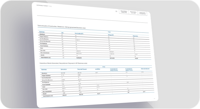 TRANSFORMING TRANSFORMING TRANSFORMING SUSTAINABILITY REPORT FY 2023 COMMUNITIES THE PLANET THE WORKPLACE Total amounts of Overburden, Wasterock, Tailings generated (Business wise) FY23 Business Unit Overburden (MT) Tailings (MT) Waste Rock Aluminium MT NA NA NA Copper Business MT NA NA NA Iron Ore Business MT 3,700,072 NA NA Oil and Gas Business MT NA NA NA Port Business MT NA NA NA Power Business MT NA NA NA Steel MT NA NA NA Zinc India MT 5,280,408 14,505,607 0 Zinc International MT 4,40,76,332 11,936,728 110,427 FACOR MT NA NA NA Total (Vedanta Ltd.) MT 53,056,812 26,442,335 110,427 Hazardous Waste Generated, Recycled and Disposed in MT (Business wise) FY23 Business Generation Recycled/ Reused Landfilled Incinerated with Incinerated w/o Otherwise disposed energy recovery energy recovery Aluminium 404,894 383,745 8,677 - 279 3,278 Copper Business 3,110 2,968 - - - - Iron Ore Business 77 59 - - 1.9 - Oil and Gas Business 34,086 43,124 - - - - Port Business 2.15 1.44 - - - - Power Business 75.6 91.87 - - 6.46 - Steel 245.3 239 13.34 - - - Zinc India 93,578 50,779 37,771 - - - Zinc International 83.5 60.7 15 - 21 - FACOR 1,089 1,071 - - 1.94 - Total (Vedanta Ltd.) 537,241 482,138 46,477 - 310 3,277 125