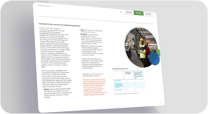 TRANSFORMING TRANSFORMING TRANSFORMING SUSTAINABILITY REPORT FY 2023 COMMUNITIES THE PLANET THE WORKPLACE Assessment of risks associated with Tailings Storage Facilities During FY 2023, we completed a • High: Actions should be implemented comprehensive assessment of all risks within the next 6 months. associated with the storage and • Moderate: Actions should be management of tailings at all our sites. At the reviewed by the EoR and site-level, this involved evaluating and implementation coordinated by the analysing all potential risks through review of RTDE, within the business planning the existing, site-level Tailings Management cycle. Implementation should occur System (TMS), taking into account the within the next 12 months. specific requirements outlined in the Global • Low: Actions should be reviewed by Industry Standard on Tailings Management the EoR and implementation (GISTM). The key aspects of the review relate coordinated by the RTDE, within the to the 6 broad areas and 15 principles related business planning cycle. to the safe design and development, Implementation should occur within operation, emergency preparedness and the next 24 months. closure of TSF’s as defined in the GISTM. The desktop review then assessed the extent of In addition to this standalone risk implementation of the TMS at the site against assessment, we also conduct regular the specific requirements of the principles of audits of all our tailing dams in the GISTM. Each requirement was then conformance with the performance assigned scores on a scale of I (low) to IV standards established under the (high). Vedanta Standard. Tailings Risk Potential FY 2023 After the successful completion of this standalone risk assessment, we are better Total Number Number of facilities Managing slurry water for reuse and of Facilities categorized as able to align our TMS with the GISTM methodology. Certain gaps have been improved tailings compaction "high risk potential" exposed as a result of this exercise, and to ("extreme" and "very Tailing slurry consists of about 50-55% high") help individual sites improve the TMS, certain water, and at Hindustan Zinc Ltd, the dry Active Facilities 16 1 actions have been prioritized. Given below is the priority ranking that will be followed to tailing plant system allows the filtration Inactive Facilities 9 0 action the changes required: process to lower the water content to ( including facilities 16%. The extracted water is then in care maintenance • Critical: Actions should be implemented circulated into the milling operation, or closed) with urgency and outside of the usual therefore reducing overall water Planned Facilities 0 0 business planning cycle. Completion within consumption. The remaining slurry is then 90 days and with corporate oversight used for compaction and plantation. involved. Zero TSF failures (due to leakage, overflow, etc) in the past four years 74