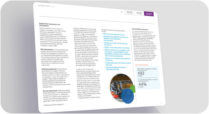 TRANSFORMING TRANSFORMING TRANSFORMING SUSTAINABILITY REPORT FY 2023 COMMUNITIES THE PLANET THE WORKPLACE Supply Chain Assessment and Capacity Building Programmes Development business-critical partners who provide Evaluation criteria for our business partners We maintain ongoing engagement with our Vedanta upholds its brand values of essential components or services with include: supply chain partners through various integrity, transparency, and responsibility limited alternative follow a risk-based initiatives such as training programmes. These with utmost dedication. To ensure approach to determine the need for • Historical financial performance training sessions are specifically designed to consistency, we have streamlined a additional due diligence or risk audits for • Management capability, including the enhance safety awareness and practices methodological approach for assessing its business partners. This may involve ability to meet regulatory among our business partners and and monitoring key performers based on third-party audits against benchmarked requirements contractors, including on-the-job safety HSE, business ethics and climate change standards. Business partners are training and safety town-halls aligned with parameters. This process helps to identify segmented based on the risks they • Stability and scale of their business Management Standard Competency, Training and track potential risks within the pose to our operations, using criteria operations and Awareness. By providing these platforms, Company’s supply chains. we not only prioritise the safety of all business such as inbound supply chain risk and • Quality of the product/service offered the significance of suppliers and service partners, but also create opportunities to Risk Assessment: Our Technical Standard providers as per defined definitions. To • Ability to adhere to our Supplier Code explore new markets and services while Supplier and Contractor Management ensure responsible sourcing, especially of Conduct - including HSE criteria, familiarising them with the best industrial outlines the fundamental components of in conflict-affected and high-risk areas MSA (Modern Slavery Act) compliance, practices. This approach allows us to deeply our Supplier Risk Management procedure. (CAHRA), robust internal management environmental compliance embed sustainability principles, including This comprehensive process establishes a practices are implemented for Vedanta's decarbonisation aspirations, • Adherence to timelines and continuity uniform method for handling risks conducting due diligence, that enables of delivery throughout the entire value chain. associated with suppliers and their Vedanta to identify, assess, and performance throughout the entire effectively manage potential risks • Collaborating with new-age innovative organization. associated with its supply chains. start-ups CAPACITY BUILDING PROGRAMS • Capacity building around best Desktop assessment: The preliminary In addition, the Company has industrial practices Total number of suppliers in capacity assessment of a supplier involves a implemented a process to identify and building programs thorough analysis conducted through report potential red flags and the desktop review. This helps us to recognize outcomes of risk assessments to senior 492 sustainability matters associated with a management. This enables Vedanta to FY 2023 supplier. These matters could be of proactively identify and address risks present significance and interest to within its supply chains. In cases where % of significant suppliers in capacity essential external stakeholders like red flags are detected, enhanced due building programs regulators, NGOs and wider industry/sector diligence measures are undertaken to developments. thoroughly investigate the presence of 44% risks, which may include serious human FY 2023 On-site Assessment: Vedanta conducts rights abuses, risks related to security annual third-party on-site assessment for forces, support to non-state armed its significant suppliers to understand groups, money laundering, tax evasion, whether the suppliers are compliant with bribery, and fraudulent social and environmental regulations misrepresentation of material origins. applicable in their respective regions Vedanta prioritises strategic or 107