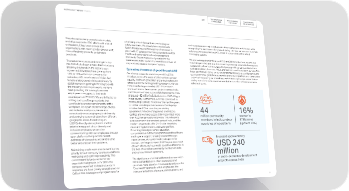 TRANSFORMING TRANSFORMING TRANSFORMING SUSTAINABILITY REPORT FY 2023 COMMUNITIES THE PLANET THE WORKPLACE They also act as very powerful role models prioritizing critical risks and are overhauling our such awareness can help to reduce animal-borne infections and diseases while and drive corporate ESG efforts with a lot of safety standards. We already have an elaborate recognizing the importance of animal well-being. Last year, we have also launched a enthusiasm. It has been proven that Safety Monitoring and Management framework in vulture recovery programme at HZL aimed at conservation of this critical organisations with more gender diverse staff, place with 17 safety performance standards and 20 scavenging species. more effectively promote sustainable health and safety technical and management At Vedanta, we continue to build long-term value one-fifth of our workforce are women. These practices. standards. We are meticulously evaluating the We acknowledge the significance of ESG and CSR considerations not only as a for our stakeholders while working to position definite goals showcase the priorities that we weaknesses in the system to prevent loss of lives at moral obligation but also as a vital common ground that can enable the long-term ourselves as a sustainability leader in the natural hold close to our hearts – ensuring cleaner air, The natural resources and mining industry any cost and create a fool-proof system.sustainability of our business. We actively engage with our various stakeholders, resources industry. We are living at a defining reduced global warming, abundant water and a has historically been a male-dominated area. such as regulators, investors, NGOs, and local communities to inform our view. This moment in human history where the impact of fairer society. By doing so, we will also de-risk Breaking this trend, in the last one year, Spreading the power of good through AAF helps us effectively deliver on our environmental stewardship, social progress, and industrialization and ecological disorder is all our business and create greater self-sufficiency women in STEM roles have gone up from Our diverse corporate social responsibility (CSR) good governance goals. I encourage all our employees, partners, and stakeholders around us. Twenty first century business leaders and resilience.13% to 16% within our company. Our initiatives across the areas of child nutrition, gender to join us in accepting our shared responsibilities so that we can ensure that our must break from the past to establish subsidiary HZL now boasts of India’s first equality, livelihood generation and animal welfare are mining operations make a positive contribution to society while minimizing any carbon-light, socially supportive ways of growth Today, the role of ESG in strengthening female underground mining engineers. To offered under the Anil Agarwal Foundation (AAF). We adverse impacts. and progress. This puts ESG at the center of business resilience, cost conservation and assist women in getting better aligned with have invested approximately USD 240 million in corporate decision-making.profitability are well accepted. We have been on the industry’s role requirements, we have socio-economic development projects across India, the ESG integration journey for more than a been providing 2X training to women and this year we have successfully improved the lives Defining new industry standards decade now and each day we work rigorously, employees compared to their male of around ~42 million individuals across 1300 villages inching closer to our goal of being one of the counterparts in FY2023. We are thrilled to be in the country. Furthermore, AAF has committed to Vedanta has been a frontrunner in practicing ‘greenest’ and most ‘people oriented’ metals setting such positive precedents that contributing USD 600 million over the next five years ESG-centred thinking. We are one of the largest and mining producers. We are proud of all that contribute to greater gender parity at the to further social impact endeavours. Our flagship natural resources companies in the world, and we have so far achieved:workplace. As a part of promoting a diverse initiative Nand Ghar uses the pre-existing produce nine out of the 17 transition metals that and inclusive workplace, we are also government network of anganwadi or childcare 44 16% green manufacturing and carbon-light • Our GHG intensity (TCO e/INR Mn) has consciously encouraging regional diversity technology solutions will need to metamorphose 2 centres and we have successfully modernized more reduced by nearly 30% against a FY2021 and are trying to recruit talent from different than 4,500 anganwadis nationwide. This network is million community women in the present towards a more sustainable future. baselinegeographic areas. Establishing an available even in the remotest parts of India, and the members in India and our STEM roles We view our role as an active agent in making LGBTQ+friendly atmosphere is another this future a reality. As an industry leader, we • RE usage has increased 14 times since modern anganwadis offer 24×7 solar electricity, countries of operations (up from 13%) FY20. We target spending USD 5 billion priority. In support of our diversity and clean and hygienic toilets, and water purifiers. have been actively incorporating sustainability towards reaching our goal of net zero inclusion emphasis, we are also E-learning-based pre-school education, and extensive ESG orientation into our operations. communicating with our employees through comprehensive nutrition programmes and healthcare operations, community outreaches and open platforms that promote honest and hygiene support, is being provided through corporate practices. Our vision of Transforming • Apart from progressive fleet exchange of viewpoints and enable us to these centres, along with livelihood support for Invested approximately for Good is focused on integrating all-rou