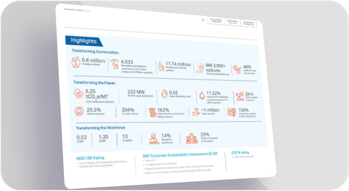 TRANSFORMING TRANSFORMING TRANSFORMING SUSTAINABILITY REPORT FY 2023 COMMUNITIES THE PLANET THE WORKPLACE Highlights Transforming Communities 0.6 million 4,533 11.74 million INR 3,990+ 40% Families skilled Nandghars established, Women and children millions Spent on local catering to 0.32 million uplifted Total Social Investments procurement women and children annually Transforming the Planet 6.25 233 MW 0.62 11.32% Zero tCO e/MT RE RTC equivalent used Water Positivity ratio reduction in freshwater Water related 2 consumption (from FY incidents GHG emissions intensity 2021 baseline) 29.3% 204% 162% ~1 million 100% Water recycled Fly ash utilised High-Volume-Low-Toxicity Trees planted operations certified Waste utilised to ISO 14001:2015 Transforming the Workforce 0.52 1.20 13 14% 25% LTIFR TRIFR Fatalities Women in Women members workforce of the Board MSCI BB Rating S&P Corporate Sustainability Assessment (DJSI) CDP B rating • Incentivisation of sustainability performance • Score: 76 for CDP climate and water through executive pay policies • Included in the DJSI world Index • Placed second in the Asia Pacific region in the metals and mining sector th • Sixth out of 216 metals & mining companies globally (98 percentile) 5