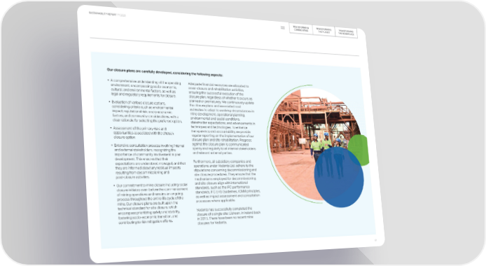 TRANSFORMING TRANSFORMING TRANSFORMING SUSTAINABILITY REPORT FY 2023 COMMUNITIES THE PLANET THE WORKPLACE Our closure plans are carefully developed, considering the following aspects: • A comprehensive understanding of the operating Adequate financial resources are allocated to environment, encompassing socio-economic, cover closure and rehabilitation activities, cultural, and environmental factors, as well as ensuring the successful execution of the legal and regulatory requirements for closure. closure plan, regardless of whether it occurs as planned or prematurely. We continuously update • Evaluation of various closure options, the closure plans and associated cost considering criteria such as environmental estimates to adapt to evolving circumstances in impact, reputational risk, socio-economic mine development, operational planning, factors, and community considerations, with a environmental and social conditions, clear rationale for selecting the preferred option. stakeholder expectations, and advancements in techniques and technologies. To enhance • Assessment of the primary risks and transparency and accountability, we provide opportunities associated with the chosen regular reporting on the implementation of our closure option. closure plan and site rehabilitation. Progress against the closure plan is communicated • Extensive consultation process involving internal openly and regularly to all internal stakeholders and external stakeholders, recognizing the and relevant external parties. importance of community involvement in plan development. This ensures that their Furthermore, all subsidiary companies and expectations are understood, managed, and that operations under Vedanta Ltd. adhere to the they are informed about any residual impacts stipulations concerning decommissioning and resulting from decommissioning and site closure procedures. They ensure that the post-closure activities. mechanisms employed for decommissioning and site closure align with international • Our commitment to mine closure including social closure initiates even before the commencement standards, such as the IFC performance of mining operations and remains an ongoing standards, IFC EHS Guidelines, ICMM principles, process throughout the entire life cycle of the as well as impact assessment and consultation mine. Our closure plans are built upon the processes where applicable. technical standard for site closure, which encompass prioritizing safety and stability, Vedanta has successfully completed the fostering socio-economic transition, and closure of a single site: Lisheen, in Ireland back contributing to risk mitigation efforts. in 2015. There have been no recent mine closures for Vedanta. 37