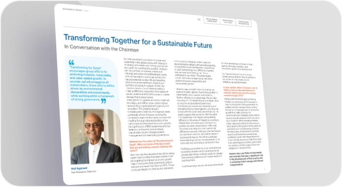 TRANSFORMING TRANSFORMING TRANSFORMING SUSTAINABILITY REPORT FY 2023 COMMUNITIES THE PLANET THE WORKPLACE Transforming Together for a Sustainable Future We envision playing an even greater role in significance and need for mined We have a vision of enhancing the the nation's growth and in enabling India to commodities is now better appreciated. well-being of communities across In Conversation with the Chairman become self-reliant in minerals and energy. India by uplifting 100 million women Vedanta is already expanding its capacities Creating a greener product portfolio and and children through education, in the aluminium and zinc sectors. providing a diverse mix of products that healthcare and welfare programs. At As India ascends to a position of power and For a country as large as India to reach its for other emerging economies on their Additionally, our oil and gas operations, are address a variety of needs is major priority Vedanta, we promote equal access leadership in the global arena, self-reliance in decarbonization targets without compromising journey of energy transition, and expanding their reserves with a vision to for us, and we are continuously driving to education, healthcare, nutrition its energy and metals and mining sources will on equitable social development, we will have low-carbon growth and development. contribute 50% to India's total oil and gas innovation in this area. We have already and sanitation to create "Transforming for Good," be crucial for reaching this position. Vedanta to start doing things very differently from the production. To strengthen our assets and launched two carbon-light and opportunities for people to improve with its portfolio of nine key metals and way we have done them so far. This is So, "Transforming for Good" is a very boost production, we have invested USD ultra-carbon light aluminium products and their lives. This includes ensuring encourages group efforts for minerals and vision of contributing to nearly embodied in our vision, "Transforming for broad concept and we hope to achieve a 1.2 billion in growth capital expenditures in similar efforts are underway. Greener that the children we support achieving inclusive, responsible, 50% of the nation’s oil and gas production, Good," which encourages group efforts to lot, across as many areas, as our FY 2023. Looking ahead, we anticipate products are the true litmus test for our complete secondary education and and value-added growth. To has a pivotal role to play. We are boosting achieve inclusive, responsible, and initiatives spread and mature. committing an additional USD 1.7 billion in ‘Transforming Together’ endeavour – as a ending hunger and malnutrition in provide real advantages to all production and investing to diversify our value-added growth. FY 2024 for various growth projects. manufacturer we are trying to make such our communities by 2030. stakeholders, these efforts will be portfolio of assets in support of this. Our In your opinion, what is Vedanta's role in Promoting further investment in the mining alternatives available that serve the needs driven by environmental Transforming for Good initiative seeks to Vedanta sees a bright future for itself as we helping India achieve self-reliance in of these metals and minerals can support of the planet and also of its people. It is I am proud to say that in FY23, we make a difference across the three pillars of partner in India's growth. Our strong position in minerals and metals and in its energy the transition to a just society and to upto our stakeholders to support, adopt have made remarkable strides stewardship and social equity, planet, workforce and communities to create base metals, which we are consolidating transitioning by 2070? combat climate change. These and endorse such products, as only then towards combatting malnutrition and while working within a framework change that is deep rooted. further, will give us an advantage. We are also India's commitment towards achieving opportunities open avenues for fruitful will the transformation be truly sustainable. achieving zero hunger. This year, of strong governance. India’s growth to greater economic might will focusing on ESG leadership as a strategic lever Net Zero emissions by 2070 has been a collaboration with the government and Nand Ghar has expanded to 4,500+ be unique, as it will be a low-carbon based, to excel on all operational parameters. major turning point in the global effort to stakeholders at large, to create a We will also continue with our strategic locations across 14 states, necessitating unprecedented ingenuity and Simultaneously, we are also diversifying and combat climate change. India is setting sustainable future. investments and prudent financial significantly increasing its reach. As innovation. The Vedanta Group’s strengthening our talent pipeline, securing our the bar for a novel approach to economic management to ensure steady a part of its nutritional improvement non-executive Chairman, Anil Agarwal, takes bonds with the community and enhancing the growth that might sidestep the Vedanta has been taking several initiatives shareholder returns and long-term impetus, Nand Ghar has introduced a us through a host of issues covering the public support that we derive. Well-founded carbon-intensive strategies many nations in support of our organization’s Net sustainable growth. multi-millet nutribar to ensure Company’s plans for the future; our vision for ESG leadership, that makes a long-lasting have previously adopted and it can serve Carbon Zero goal. Further, by 2030, we We have been continuously investing in comprehensive nourishment for meeting the dual national priorities of low difference in its areas of impact, is a business as a model for other emerging markets. hope to have 2.5 GW of continuously volume expansion, backward integration every child in alignment with the carbon use and fast-track economic growth; differenti
