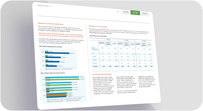 TRANSFORMING TRANSFORMING TRANSFORMING SUSTAINABILITY REPORT FY 2023 COMMUNITIES THE PLANET THE WORKPLACE Management of Non-Hazardous Waste High Volume Low Toxicity Waste Non-hazardous waste covers general waste like paper, plastic, wood, Our operations generate High Volume Low Toxicity Waste (HVLT) like fly ash, bottom ash, red mud (aluminium refinery scrap metals and food waste. Given our commitment towards zero waste waste), jarosite (from zinc smelting), slag, lime grit (process residues from smelters and aluminium refineries), and to landfill, we aim to utilize all non-hazardous waste. phosphogypsum (phosphoric acid plant). TSPL follows a strict ‘No Single-Use Plastic’ policy and has received Single High-Volume-Low-Toxicity Waste Use Plastic Free certification from the Confederation of Indian Industry (CII). FY 2021 FY 2022 FY 2023 As a part of the certification process, verification is done by CII, under the Generated Recycled/ % Generated Recycled/ % Generated Recycled/ % provisions of the Plastics-use Protocol: Verification and Certification (Million MT) Reused Recycled (Million MT) Reused Recycled (Million MT) Reused Recycled (1.0). Cairn has received a similar certification from CII. (Million MT) (Million MT) (Million MT) HVLT Waste Disposal (metric tonnes) Fly Ash 13.98 15.4 110% 14.54 16.7 115% 13.85 28.2 204% (*includes Fly ash and Bottom ash) 2023 37,58,432 2,99,30,371 Slag 1.01 1.15 114% 1.31 1.27 100% 1.35 1.31 96% 31,08,569 Jarosite 0.6 0.15 25% 0.64 0.096 97% 0.63 0.2 33% 2022 1,85,94,629 30,17,823 Red Mud 2.27 0.13 5.70% 2.51 0.52 15% 2.55 0.15 6% 2021 1,68,43,075 Lime Grit - - - 0.01 0.012 21% 0.009 0.01 104% 2020 26,14,430 1,33,25,785 Total HVLT 17.85 16.83 94.28% 19.01 18.6 98% 18.42 29.93 162% Total waste recycled/ reused Total waste disposed Mineral Waste Disposal (metric tonnes) Acid Rock Drainage Management 2,62,34,497 This condition occurs when mining cause long-term damage to both practices for the scientific and 2023 3,18,264 2,64,42,334 residue reacts with surface water and surface water and groundwater. Out systematic management of ARD 1,10,427 shallow subsurface water, to create of the 17 mines under Vedanta's and its associated environmental 1,85,71,046 2022 2,04,840 reactive mineral waste. Acid rock ownership and control, six mines – impacts. In all our ARD-affected 1,86,67,036 drainage (ARD) is a significant Kayad, Rampura, Agucha, Zawar, BMM mines, measures are being 1,00,921 1,87,10,338 environmental concern for the mining and Gamsberg, exhibit ARD, which is implemented in conformance with 2021 22,51,677 industry, and needs to be handled about 35% of our total mines. this technical standard. 1,87,10,338 22,51,677 responsibly. If left in an unstable 1,50,59,116 condition ARD can hinder successful We have a Technical Standard on ARD 2020 1,41,35,872 revegetation of mining wastes and that incorporates industry-leading 1,50,59,116 1,41,35,872 Mineral waste generated - Waste rock Mineral waste generated - Tailings Mineral waste repurposed/reused Total mineral waste disposed 70