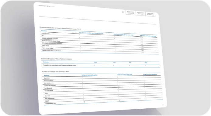 TRANSFORMING TRANSFORMING TRANSFORMING SUSTAINABILITY REPORT FY 2023 COMMUNITIES THE PLANET THE WORKPLACE Revenue contribution of sites in Water Stressed Areas (FY23) Business Total Sites Accessed for water risk (basin-level) Sites accessed with high risk (basin-level) % Revenue contribution to the group Oil & Gas Cairn 7 7 10.34% HZL 9 9 22.78% Vedanta Aluminium – Lanjigarh 1 1 3.74% Facor Ltd, Sukinda, Jajapur, Odisha 1 1 0.53% IOK, Megalhalli, Chitradurga, Karnataka 1 1 1.15% VGCB, Vizag 1 1 0.00% TSPL, Mansa, Punjab 1 1 3.99% Sterlite Copper, Tuticorin, Tamilnadu 1 1 0.00% Business Impacts of Water Related Incidents Incidents FY20 FY21 FY22 FY23 Total actual and opportunity costs from water-related incidents 0 0 0 0 Number of Tailings dam (Business wise) Business Number of active tailings dam Number of inactive tailings dam Number of closed tailings dam Aluminium 9 2 4 Copper Business 0 1 0 Iron Ore Business 0 0 0 Oil and Gas Business 0 0 0 Port Business 0 0 0 Power Business 1 0 0 Steel 0 0 0 Zinc India 3 1 0 Zinc International 3 0 1 FACOR 0 0 0 Total (Vedanta Ltd.) 16 4 5 123