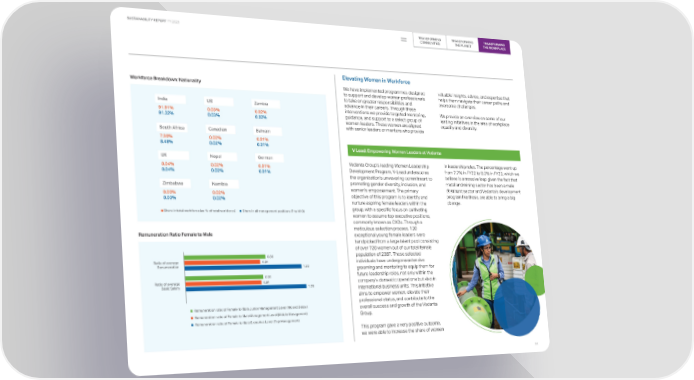 TRANSFORMING TRANSFORMING TRANSFORMING SUSTAINABILITY REPORT FY 2023 COMMUNITIES THE PLANET THE WORKPLACE Elevating Women in Workforce Workforce Breakdown: Nationality We have implemented programmes designed valuable insights, advice, and expertise that to support and develop women professionals helps them navigate their career paths and to take on greater responsibilities and overcome challenges. India US Zambia advance in their careers. Through these interventions we provide targeted mentoring, We provide an overview on some of our 91.91% 0.03% 0.02% guidance, and support to a select group of leading initiatives in the area of workplace 91.32% 0.03% 0.02% women leaders. These women are aligned equality and diversity. with senior leaders or mentors who provide South Africa Canadian Bahrain 7.90% 0.02% 0.01% 8.48% 0.02% 0.01% V Lead: Empowering Women Leaders at Vedanta UK Nepal German in leadership roles. The percentage went up 0.04% 0.02% 0.01% Vedanta Group's leading Women Leadership 0.04% 0.02% 0.01% Development Program, V-Lead underscores from 7.7% in FY22 to 9.2% in FY23, which we the organization's unwavering commitment to believe is a massive leap given the fact that Zimbabwe Namibia promoting gender diversity, inclusion, and metal and mining sector has been a male women's empowerment. The primary dominant sector and Vedanta’s development 0.03% 0.02% objective of this program is to identify and program like these, are able to bring a big 0.03% 0.02% nurture aspiring female leaders within the change. Share in total workforce (as % of total workforce) Share in all management positions (P to M10) group, with a specific focus on cultivating women to assume top executive positions, commonly known as CXOs. Through a meticulous selection process, 120 Remuneration Ratio Female to Male exceptional young female leaders were handpicked from a large talent pool consisting of over 720 women out of our total female 0.86 population of 2387. These selected Ratio of average 0.84 individuals have undergone extensive Renumeration 1.22 grooming and mentoring to equip them for 0.85 future leadership roles, not only within the Ratio of average 0.84 company's domestic operations but also in Basic Salary 1.23 international business units. This initiative aims to empower women, elevate their professional status, and contribute to the Remuneration ratio of Female to Male Junior Management Level (M6 and Below) overall success and growth of the Vedanta Remuneration ratio of Female to Male Management Level (Middle Management) Group. Remuneration ratio of Female to Male Executive Level (Top Management) This program gave a very positive outcome, we were able to increase the share of women 94