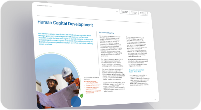 TRANSFORMING TRANSFORMING TRANSFORMING SUSTAINABILITY REPORT FY 2023 COMMUNITIES THE PLANET THE WORKPLACE Human Capital Development Enriched quality of life Our workforce plays a pivotal rolein the effective implementation of our Our focus is on providing the necessary To foster a sense of community and strategic goals and in executing sustainable business performance. resources, opportunities, and support provide recreational opportunities, Vedanta's people-first approach is geared towards fostering a culture that systems that enable our workforce to Vedanta creates social spaces. This is engaging and empowering. Our core values of innovation, creativity, and reach their full potential. We seek to includes clubs, which offer avenues for diversity infuse our organizational culture and inform our industry-leading empower our employees to strike a leisure activities and social interactions, harmonious balance between personal promoting a healthy work-life balance. people practices. needs and desires and professional Essential amenities like markets are also responsibilities and ambitions. We foster located onsite, to help provide a culture of continuous learning, nurture convenient access to daily necessities. leadership talent, and develop strong Moreover, the availability of gyms in the employee engagement, thereby helping societies promotes physical well-being, to enhance individual and collective encouraging employees to maintain a performance. healthy and active lifestyle. Our goal of enriching the quality of life of By offering these amenities and creating our employees, encompasses both a conducive environment, we recognise full-time employees and our business that employees need to have a partners (contractors), and we take a congenial work life balance, to remain holistic approach to employee wellbeing. engaged and productive. One aspect of enhancing the quality of Kincentric Best Employer life of our employees is by providing Award – India 2022 essential amenities. Our plant sites are accompanied by self-sufficient townships where all daily necessities for comfortable Vedanta has been conferred with a Our HR priorities are driven by living are easily accessible including prestigious global recognition. four levers schools, markets, clubs, and gyms. The award comes as part of Kincentric’s • Freedom to have an robust assessment that measures and enriched quality of life Vedanta provides accommodation for its identifies organizations who have employees, ensuring comfortable living transformed their people practices • Freedom to learn and grow spaces that meet their needs. leading to better business outcomes. • Freedom to innovateand Additionally, we also provide schools for maximise potential employees' children, ensuring access to • Freedom to be recognised quality education. and rewarded 109