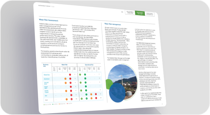 TRANSFORMING TRANSFORMING TRANSFORMING SUSTAINABILITY REPORT FY 2023 COMMUNITIES THE PLANET THE WORKPLACE Water Risk Assessment Water Risk management Vedanta takes a science-based approach to Sustainable Development (WBCSD) All water-related issues come under direct practices across the organization in order water management at each of our comprising of Water Risk Filter, India Water Board-level oversight. The Board’s ESG to safeguard water resources over the operational sites and the process involves Tool Version 4 (IWT 4.0), and also WRI's Committee regularly reviews the water-related lifecycle of an asset. By doing so, water risk assessment, risk categorization, Aqueduct Water Tool. status of our sites, going through comparability and parity in assessment is targeted solution identification and assessments and performance metrics, ensured, leading to more effective implementation followed by periodic The business units are categorized based on evaluating future scenarios and taking remedial measures being designed and performance reviews. The water-related their overall water risk. Internal Risk decisions to ensure stability and consistency implemented. business risk assessment is undertaken at Assessment of the business units includes of water resources. The Group Head – HSE & the catchment level, over the lifecycle of an comparing the incoming risk likelihood score Sustainability updates the Board ESG Our stakeholder engagement standard, asset covering, but not limited to, physical, with the outcomes from the Water Risk Committee on long-term actions that the helps us to identify and prioritize regulatory, environmental/ ecological, Monetizer tool. Basin-level value chain water company is taking to better manage the stakeholders who are impacted by our social/reputational, and economic risks to risk assessments are conducted to quantify evolving impact of climate change on our business operations or vice versa. Given the business. inherent water risks, along with water supplies. The Board members are also that many of our operational sites are local/operational assessments to measure informed about the progress on water situated in water-stressed regions, we The baseline operational and basin water risk residual water risks. By combining basin and management as a part of the overview maintain a systematic approach towards assessment for businesses and operational risk data, we identify the sites provided on the Group’s ESG performance. tracking and monitoring existing communities is conducted using a suite of with the highest risk, residual risks, and stakeholder concerns around water and tools from World Business Council for prioritise on shared water challenges. The Vedanta Water Management Standard the mitigation measures being taken. This seeks to standardize water management approach helps us to address water-related concerns proactively, take steps towards sustainable water Business Basin Risk Operational Risk management and collaborate with our Unit stakeholders in ensuring a water-secure Very Low Medium High Total Very Low Medium High Total future for all. Low Risk Risk Risk Sites Low Risk Risk Risk Sites Risk Risk Another critical aspect of our water Oil and Gas - - - 7 7 2 5 - - 7 management strategy is to review water-related risks through the lens of Aluminium - - 2 1 3 - 3 - - 3 regulatory changes and potential changes in price structure. Aspects like water tariffs, Iron and - - 6 3 9 1 8 - - 9 withdrawal restrictions, discharge Steel standards, discharge tariffs are Power - - - 1 1 - 1 - - 1 independently evaluated to assess the TSPL extent and likelihood of their impact on Sterlite - - 3 1 4 1 3 - - 4 operations and how they can affect water Copper availability and viability. Zinc - - - 9 9 - 6 2 1 9 Further, each of our operational sites have Total - - 11 22 33 4 26 2 1 33 a Water Management Plan (WMP). These plans are updated every year in conjunction with the annual value of water Very Low Risk Low Risk Medium Risk High Risk balance assessed at each individual site. 64