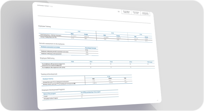 TRANSFORMING TRANSFORMING TRANSFORMING SUSTAINABILITY REPORT FY 2023 COMMUNITIES THE PLANET THE WORKPLACE Employee Training FY21 FY22 FY23 Male Female Male Female Male Female Total Training Hours - Full-time Employees 351,610.20 66,632.80 252,468.39 48,383.39 3,22,003 94,896 Average Training Hours for FTEs 23.23 34.87 16.95 24.66 21.91 39.76 Periodic assessment of all employees Employee assessment and review Percentage Coverage FY 23 Employee undergoing periodic assessment and review 100% Employee undergoing multi assessment 2.55% Employee Well-being FY20 FY21 FY22 FY23 FY23 target % of employees with top level of engagement, - 80 83 84 90 satisfaction (% of satisfied employees) % of employees who responded to the survey - 67 73 76 Training & Development FY 23 Employee Training Male Female Total Average hours per FTE of training and development 21.91 39.76 24.3 Average amount spent per FTE on training and development (INR) 1,094.73 1,877.40 1204.1 Employee Development Programs Name of the program % of FTEs participating in the program V-Lead 13.9 Emerging Leaders Program 18 132