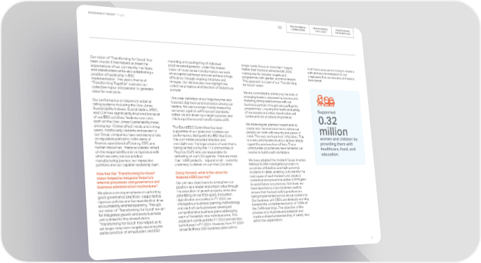 TRANSFORMING TRANSFORMING TRANSFORMING SUSTAINABILITY REPORT FY 2023 COMMUNITIES THE PLANET THE WORKPLACE Our vision of "Transforming for Good," has reporting, and spotlighting of individual longer solely focus on short-term targets. In all these ways we are trying to create a been crucial. It has helped us meet the positive developments. Under this shared Rather their horizons will extend till 2030, safe and secure workplace for our expectations of our community members vision of incremental transformation, we work making way for broader targets and employees that can become an industry and stakeholders while also establishing a on accepted pathways and can achieve a huge programmes with greater, accretive impact. benchmark. position of leadership in ESG difference through ongoing initiatives and This approach is a part of our "Transforming FY 2022-23 proved to be a precursor for How would you describe the transformation implementation. This year’s theme of linkages. Our disclosures now highlight the for Good" vision. the future, as we saw India’s economy achieved as a part of Vedanta's ESG journey?"Transforming Together" captures our collective progress and direction of Vedanta as breaking away from the rest of the world to At Vedanta, we have always been committed collective vigour and passion to generate a whole. We are committed to enhancing the skills of define its own unique growth numbers. towards sustainable and responsible mining value for everyone. emerging leaders, empowering women, and Driven by healthy macroeconomic practices. We acknowledge the significant This clear definition of our trajectory has also fostering strong relationships with our fundamentals and domestic consumption, impact that our operations can have on local Our performance on important external fostered alignment and motivation among our business partners through various flagship FY2023 saw India reaching an impressive communities, ecosystems, and the rating systems including the Dow Jones leaders. We are no longer merely measuring programmes. Ensuring the health and safety Supported 6.8% GDP growth. Developed countries, environment. To address this, we have put in Sustainability Indexes, Sustainalytics, MSCI, ourselves against self-imposed standards; of our people and other stakeholders will including China, saw subdued growth in place a comprehensive sustainability framework and CDP has significantly improved because rather, we are driven by a larger purpose, and continue to be of utmost importance. the face of inflation and recessionary that acts as an anchor and a check, balancing of our ESG activities. Vedanta now ranks this is a profound and transformative shift. 0.32 pressures.the larger environmental and humanitarian sixth on the Dow Jones Sustainability Index, We make regular, planned investments to concerns against business needs and among top 10 diversified metals and mining The Board ESG Committee has been create zero-harm environments, where our peers. Additionally, Vedanta and several of supportive of our goals and monitors our people can work with security and peace of High commodity prices, however, affected exigencies. All our decision-making processes million bottom line growth for Indian businesses thus answer to the dual needs of harmonizing our Group companies have won many prizes performance. Along with the ESG ManCom, mind. This year, we have had 13 fatalities. This women and children by in the first half of the year. Against this economic progress with environmental, social, on reputable platforms in the areas of this committee provided direction and is a very unfortunate situation, and we deeply providing them with backdrop, Vedanta has posted a and governance (ESG) considerations. finance, operational efficiency, CSR, and oversight over the large volume of work that is regret the precious loss of lives. These commendable financial performance. Our human resources. These accolades reflect being carried out by the 14 Communities of unfortunate occurrences have hardened our healthcare, food, and consistent operational efficiencies and The past year was a challenging one due to the on the responsibility and competence with Practice (CoP), who are responsible for resolve to build a safe workplace. education. strong cost control has made us a much unpredictable macroeconomic environment which we carry out our product delivering on our ESG agenda. There are more more resilient company, solidifying caused by the ongoing Russia-Ukraine conflict. manufacturing journey, our impressive than 1,000 projects – big and small – currently We have adopted the Incident Cause Analysis the competitive advantage that we However, we adopted a holistic approach and portfolio and our capable leadership team.underway to deliver on our nine ESG aims.Method (ICAM) investigation process to command.could achieve excellent operating performance scrutinize all fatalities and high-potential despite the external shocks and the need for How has the “Transforming for Good” Going forward, what is the vision for incidents in detail, enabling us to identify the The company's ESG goals cover an realignment of our supply chains. Our guiding vision helped to integrate Vedanta’s Vedanta’s ESG journey? root cause of each incident and create a extremely broad canvas, reflecting our philosophy of 'Transforming for Good,' helped internal processes and governance and Our primary objective is to strengthen our corrective and preventive action (CAPA) plan philosophy of “Transforming for Good” by our efforts by fostering a more integrated business administration mechanisms? position as a leader and unlock value through to avoid future occurrences. Moreover, we taking the responsibility for environmental business approach both in terms of our We place a strong emphasis on upholding the execution of growth projects, while also have launched a cross-business audit to stewardship via decarbonization, the operation