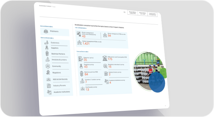 TRANSFORMING TRANSFORMING TRANSFORMING SUSTAINABILITY REPORT FY 2023 COMMUNITIES THE PLANET THE WORKPLACE Stakeholders consulted to prioritize the topics based on how it impacts Vedanta Internal Stakeholders Internal Stakeholders Employees Senior management Senior management FGDs on site online interviews/survey 94 43 External Stakeholders Senior management FGDs on site Customers 1,421 Suppliers External Stakeholders Business Partners Customer survey CSR partners and Communities FGD Investors & Lenders 35 175 Suppliers survey Regulators interview & survey Community 43 16 Regulators Business partners FGD Industry forums survey 84 2 NGO & Civil Society Investors / Lenders survey 7 Academic Institutions survey 4 Industry Forums Civil Society survey Academic Institutions 13 25