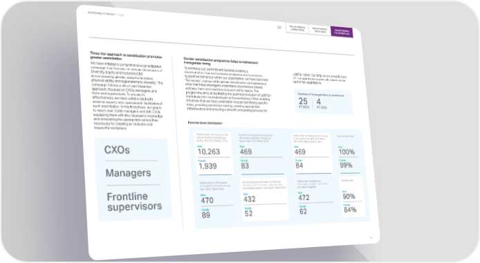 TRANSFORMING TRANSFORMING TRANSFORMING SUSTAINABILITY REPORT FY 2023 COMMUNITIES THE PLANET THE WORKPLACE Three-tier approach to sensitization promotes Gender sensitisation programme helps to mainstream greater assimilation transgender hiring We have initiated a comprehensive sensitization To reinforce our commitment towards creating a LGBTQ+ talent. Currently, we are proud to have campaign that focuses on various dimensions of discrimination-free and inclusive workplace and to promote 25 transgender employees who are an active Diversity, Equity and Inclusion (DEI) supportive behaviour within our organization, we have launched part of the organization. encompassing gender, sexual orientation, ‘Samanvay’, a group-wide gender sensitization and awareness physical ability and regional/ethnic diversity. This drive that helps managers understand unconscious biases, campaign follows a structured three-tier address them and maximize inclusion within teams. The Number of transgenders in workforce approach, focused on CXOs, managers, and programme aims at facilitating the seamless inclusion of LGBTQ+ front-end supervisors. To ensure its individuals into the mainstream at the workplace. Other enabling 25 4 effectiveness, we have collaborated with initiatives that we have undertaken include identifying specific FY 2023 FY 2022 external experts who specialize in facilitation of roles, providing sensitivity training, creating appropriate such assimilation. In the first phase, our goal is infrastructure and ensuring a smooth onboarding process for to reach over 2,000 managers and 300 CXOs, equipping them with the necessary knowledge and stimulating the appropriate sensibilities Parental leave distribution necessary for creating an inclusive and respectful workplace. Total Number of Employees that Number of employees who resumed Total number of employees who are due Return to Work Rate were entitled to Parental leave office post completion of paternal to return to work in April 2022-March during April 2022-March 2023 leave in April 2022-March 2023 2023, after taking parental leave CXOs Male Male Male Male 10,263 469 469 100% Female Female Female Female Managers 1,939 83 84 99% Total Number of Employees No of employees who were in continuous Total number of employees Retention rate who took Parental leave during service for next 12 months after returning returning from parental leave in the April 2022- March 2023 from Parental leave in April 2022- March 2023 prior reporting period Frontline Male Male Male Male supervisors 470 432 472 90% Female Female Female Female 89 52 62 84% 96