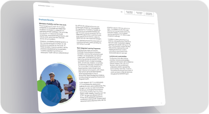 TRANSFORMING TRANSFORMING TRANSFORMING SUSTAINABILITY REPORT FY 2023 COMMUNITIES THE PLANET THE WORKPLACE Employee Benefits Workplace flexibility and Part time work: As of FY23, the widespread remote work potential to assume CXO roles within 8-10 The emergence of Covid-19 compelled initiative was phased out. Acknowledging years. This initiative not only offers rapid companies to reevaluate and adapt their the significance of workplace flexibility, we advancement but also fosters mentorship workplace strategies to safeguard the have a policy on workplace flexibility and from senior leaders, cross-functional well-being of their workforce. This led to the part time work wherein employees are now learning opportunities, and tailored career introduction of measures like health offered the opportunity to work from home progression pathways. screenings, social distancing protocols, and under special circumstances, subject to remote work, which became standard agreement with their respective managers. In addition to these overarching Group across all our locations. This approach ensures the preservation of initiatives, individual Business Units devise However, considering Vedanta's position in operational efficiency while upholding the their own Career Development Initiatives the manufacturing sector where on-site well-being of our staff. catering to their specific talent pools. The presence is essential, as the Covid-19 "Star of the Business" program identifies threat receded, it became evident that the Work Integrated Learning Programme high-potential employees from both practices adopted during the pandemic enabling and technical functions, could be adjusted to prioritize our Vedanta enlists bright and dynamic culminating in personalized career employees' health without compromising it. individuals from prestigious universities development plans for each year. worldwide, nurturing their potential through strategic role assignments, well-defined Lactation and creche facilities career paths, cross-functional projects, The Business Units offer childcare mentoring, and top-tier benefits. To ensure amenities, including crèche facilities, a constant infusion of adept knowledge, catering to both Vedanta staff and Business skills, and attitudes, Vedanta concentrates Partners. Notably, Cairn, one of our on enhancing employees' competencies. Business Units, has established a This focus caters to both present and collaboration with the reputable Play future business needs through robust School and Day Care Chain, Footprints. talent development programs, with multiple This partnership ensures the provision of interventions aimed at talent retention. crèche services to all female employees Vedanta spearheads an array of throughout the Delhi-NCR region. Group-Wide Talent Development Initiatives, including Vedanta Leadership Development Program (VLDP). VLDP, initiated in 2017, is a meticulously structured leadership development pathway for early-career professionals. This program recruits top talent from premier B-Schools and Engineering Campuses across India, molding them into future leaders within Vedanta. Presently, over 150 VLDP members are affiliated with the Group. VLDP participants experience accelerated career growth, enabling lateral movement across Business Units, with the 114