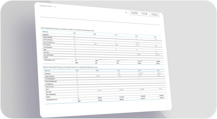 TRANSFORMING TRANSFORMING TRANSFORMING SUSTAINABILITY REPORT FY 2023 COMMUNITIES THE PLANET THE WORKPLACE Direct Renewable Energy consumption within the organization (Business wise) Business Unit FY20 FY21 FY22 FY23 Aluminium GJ - - 307 71,018 Copper Business GJ - - - - Iron Ore Business GJ 0 0 915,564 - Oil and Gas Business GJ 2,284 2,363 1,810 4,341 Port Business GJ - - - - Power Business GJ - 41 48 42 Steel GJ - - - 219 Zinc India GJ - - 198,386 3,460,663 Zinc International GJ - - - - FACOR GJ - - - - Total (Vedanta Ltd.) GJ 2,284 2,404 1,116,115 3,536,283 MWH 634 668 310,057 982,301 Indirect Renewable Energy consumption within the organization (Business wise) Business Unit FY20 FY21 FY22 FY23 Aluminium GJ - 2,432 10,850,720 4,655,615 Copper Business GJ 82,966 72,887 69,602 64,909 Iron Ore Business GJ - - - - Oil and Gas Business GJ - - - - Port Business GJ - - - - Power Business GJ - - - - Steel GJ - - - - Zinc India GJ 519,049 2,049,468 2,586,586 155,524 Zinc International GJ - - - - FACOR GJ - - - - Total (Vedanta Ltd.) GJ 602,015 2,124,787 13,506,908 4,876,048 MWH 167,240 590,266 3,752,219 1,354,458 116