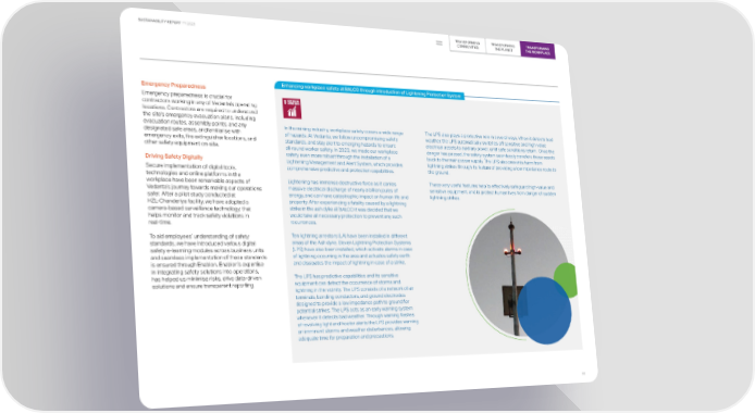 TRANSFORMING TRANSFORMING TRANSFORMING SUSTAINABILITY REPORT FY 2023 COMMUNITIES THE PLANET THE WORKPLACE Enhancing workplace safety at BALCO through introduction of Lightening Protection System Emergency Preparedness Emergency preparedness is crucial for contractors working in any of Vedanta’s operating locations. Contractors are required to understand the site's emergency evacuation plans, including evacuation routes, assembly points, and any In the mining industry, workplace safety covers a wide range The LPS also plays a protective role in several ways. When it detects bad designated safe areas, andfamiliarise with of hazards. At Vedanta, we follow uncompromising safety weather, the LPS automatically switches off sensitive and high-value emergency exits, fire extinguisher locations, and standards, and stay alert to emerging hazards to ensure electrical assets to auxiliary power, until safe conditions return. Once the other safety equipment on-site. all-round worker safety. In 2023, we made our workplace danger has passed, the safety system seamlessly transfers these assets safety even more robust through the installation of a back to the main power supply. The LPS also prevents harm from Driving Safety Digitally Lightening Management and Alert System, which provides lightning strikes through its feature of providing a low impedance route to Secure implementation of digital tools, comprehensive predictive and protection capabilities. the ground. technologies and online platforms in the workplace have been remarkable aspects of Lightening has immense destructive force as it carries These very useful features help to effectively safeguard high-value and Vedanta’s journey towards making our operations massive electrical discharge of nearly a billion joules of sensitive equipment, and to protect human lives from danger of sudden safer. After a pilot study conducted at energy, and can have catastrophic impact on human life and lightning strikes. HZL-Chanderiya facility, we have adopted a property. After experiencing a fatality caused by a lightning camera-based surveillance technology, that strike in the ash dyke at BALCO it was decided that we helps monitor and track safety violations in would take all necessary protection to prevent any such real-time. recurrences. To aid employees’ understanding of safety Ten lightning arrestors (LA) have been installed in different standards, we have introduced various digital areas of the Ash dyke. Eleven Lightning Protection Systems safety e-learning modules across business units (LPS) have also been installed, which activate alarms in case and seamless implementation of these standards of lightning occurring in the area and actuates safety earth is ensured through Enablon. Enablon’s expertise and dissipates the impact of lightning in case of a strike. in integrating safety solutions into operations, has helped us minimise risks, drive data-driven The LPS has predictive capabilities and its sensitive solutions and ensure transparent reporting. equipment can detect the occurrence of storms and lightning in the vicinity. The LPS consists of a network of air terminals, bonding conductors, and ground electrodes designed to provide a low impedance path to ground for potential strikes. The LPS acts as an early warning system whenever it detects bad weather. Through warning flashes of revolving light and hooter alerts the LPS provides warning on imminent storms and weather disturbances, allowing adequate time for preparation and precautions. 90