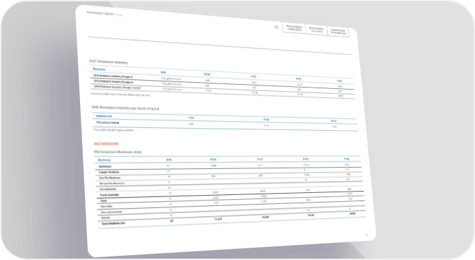 TRANSFORMING TRANSFORMING TRANSFORMING SUSTAINABILITY REPORT FY 2023 COMMUNITIES THE PLANET THE WORKPLACE GHG Emissions Intensity Business Unit FY20 FY21 FY22 FY23 GHG Emission Intensity (Scope 1) (TCO2e/INR Million) 68.8 60.61 45.39 39.32 GHG Emission Intensity (Scope 2) (TCO2e/INR Million) 2.23 1.35 2.55 5.63 GHG Emission Intensity (Scope 1 and 2) (TCO2e/INR Million) 71.04 61.96 47.94 44.95 Intensity calculation does not include BMM and Fujairah Gold. GHG Emissions Intensity per tonne of metal Vedanta Ltd FY21 FY22 FY23 TCO2e/ton of metal 6.45 6.14 6.25* *This number excludes Fujairah and BMM AIR EMISSIONS PM Emissions (Business wise) Business Unit FY20 FY21 FY22 FY23 Aluminium MT 2,908 2,611 4,754 6,072 Copper Business MT 0 0.16 Iron Ore Business MT 324 478 1,085 1,450 Oil and Gas Business MT 41 256 Port Business MT - Power Business MT 4,634 4,846 4,921 5,987 Steel MT 2,322 10,653 3,373 Zinc India MT 1,027 1,105 964 1,047 Zinc International MT - FACOR MT 62 67 Total (Vedanta Ltd.) MT 11,215 19,693 11,827 18,252 120