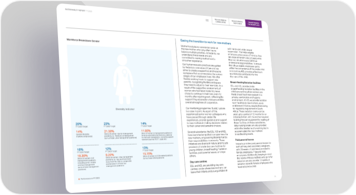 TRANSFORMING TRANSFORMING TRANSFORMING SUSTAINABILITY REPORT FY 2023 COMMUNITIES THE PLANET THE WORKPLACE Easing the transition to work for new mothers Workforce Breakdown: Gender Motherhood places several demands on safe hands and under proper the new mother, who very often has to supervision. This helps eligible balance multiple priorities. At Vedanta, we employees enjoy peace of mind as they understand these needs and are are close at hand in case of need, while committed to making motherhood a they can simultaneously fulfil their smoother experience. professional responsibilities. To ensure Our human resource practices are guided that all our eligible employees get to by Vedanta's core value of Care and we utilize the convenience of the onsite child strive to create a supportive and inclusive care centres, HZL provides a fixed sum workplace that accommodates the various as child-care contribution for the stages of our employees' lives. We offer day-care of the child. flexible working hours to support new Breast-feeding/lactation facilities parents, recognizing the time and space they need to adjust to their new roles. As a ESL and HZL provide onsite result of the supportive environment, of breast-feeding/ lactation facilities in the women who had taken maternity leave child care centres where women can chose to continue in their roles even 12 freely breast feed their newborn in a months after rejoining work, reflecting the private, comfortable and hygienic support they received in childcare and the environment. At VZI, we provide lactation overall atmosphere of cooperation. room facilities to new mothers, as an enablement initiative, despite there being Diversity Indicator Our mentoring programme ‘Buddy’ system no regulatory requirement in South is a case in point. As a part of this, Africa. These lactation rooms can be experienced senior women colleagues who used upto a period of 12 months for an have passed through similar life individual infant, with the mother required experiences, provide guidance and support to bring her own equipment for availing of 20% 23% 14% to new mothers in making decisions related these facilities. At these subsidiaries, FY 2030 Target FY 2030 Target FY 2030 Target to their career and personal choices. daily nursing breaks are also provided 14% 21.30% 11.80% within the timeframe of a working day to Gender diversity Share of women in junior management Share of women in management positions in Several subsidiaries like ESL, VZI and HZL accommodate the new mothers’ (Fulltime employees) positions, i.e., first level of management revenue-generating functions (e.g. sales) as have launched empathetic programmes for breastfeeding needs. (as % of total junior management positions) % of all such managers (i.e. excluding support new mothers, empowering them to handle functions such as HR, IT, Legal, etc.) their responsibilities more easily. These Paid parental leaves initiatives are diverse in nature, and include Vedanta provides paid parental leaves for 18% 12% 13% provision of onsite day care facilities for both primary and secondary caregivers, FY 2030 Target FY 2030 Target FY 2030 Target young children, breast feeding / lactation 18.30% 9.20% 15.70% facilities, paid parental leaves, amongst with 26 weeks of paid leave provided to Share of women in all Share of women in top management Share of women in STEM-related positions others. female employees, 7 days to male management positions, positions, i.e. maximum two levels (as % of total STEM positions) employees. Additionally, keeping in mind including junior, middle away from the CEO or comparable the needs of those mothers who go in for and top management positions (as % of total top Day care centres (as % of total management management positions) adoption we also provide 12 weeks of positions) ESL and HZL are providing day care adoption leave to female employees who centres onsite where new mothers can have adopted a child. leave their infants and young children in Performance in FY 2023 95